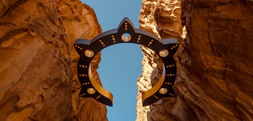 In a recent art exhibit, on a big anamorphous rock in AlUla, an ancient oasis in the Medina region of Saudi Arabia, an electric blue sculpture of a woman is made, seated in the meditative yogic position called “lotus.” Her legs are crossed while her hands extend out with her palms open on either knee. Her eyes are closed as she connects with the silence and nature that surrounds her. its the first time in over 1,000 years that a figurative female sculpture has been displayed in Saudi Arabia, where Islamic art forbids figurative representation, especially of women. This fictional female astronaut (NAJMA- means ‘star’ in Arabic) arrived on earth to spread knowledge and understanding throughout the planet, according to the artist Lita Albuquerque (Tunisian Catholic). She added “The doors have finally opened to something collaborative like this bringing international, Middle Eastern and Saudi artists together.” It is historic, she says, not only that the figure is being shown, but that “it is accepted.”