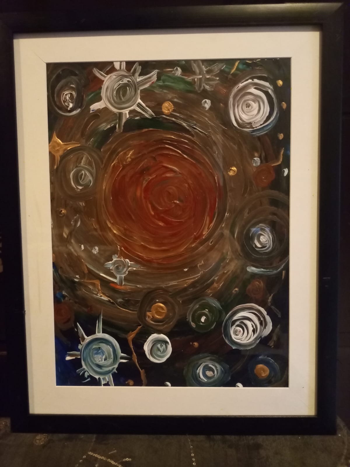 A captivating semi-abstract acrylic artwork inspired by celestial motion and cosmic energy. A warm central vortex is surrounded by orbiting forms and star-like accents, symbolizing movement, balance, and the rhythmic pulse of the universe.