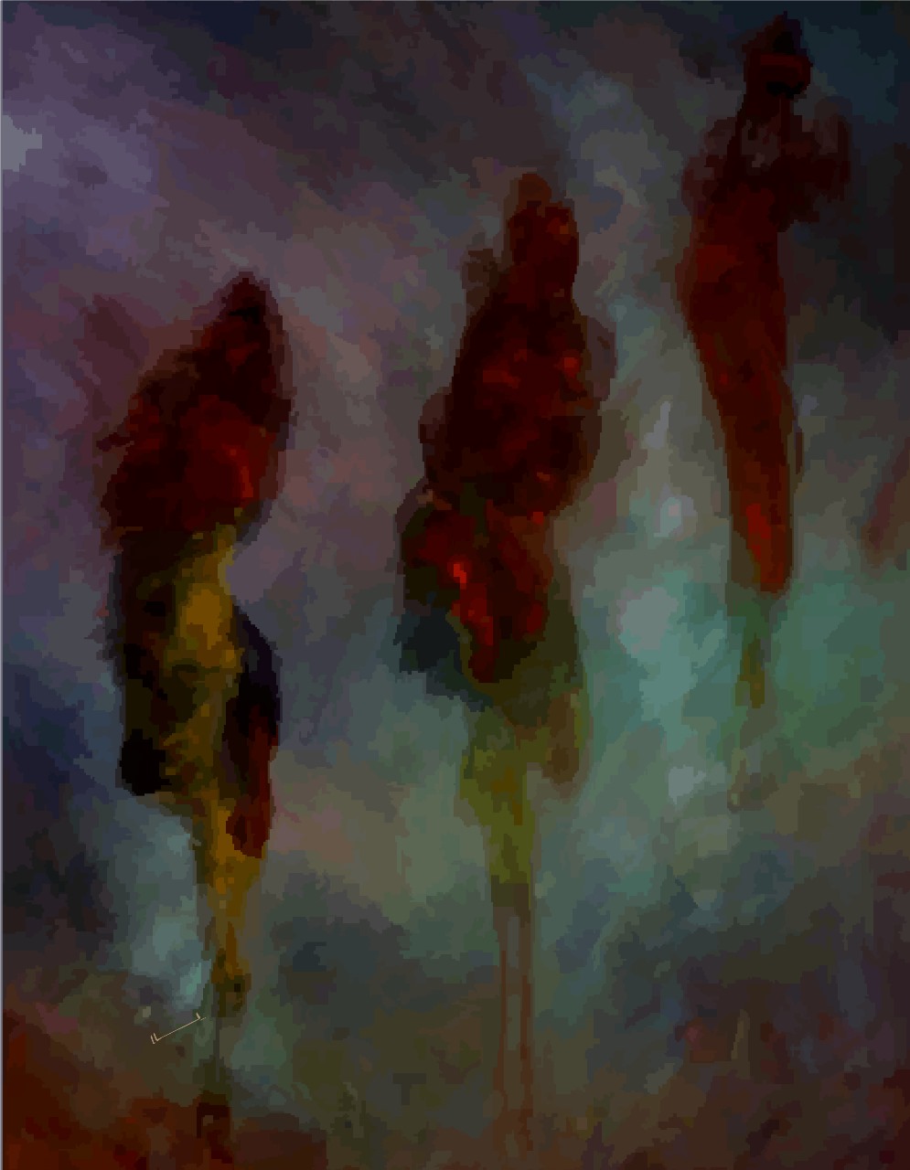 A deeply expressive oil painting portraying abstract human forms emerging through layered shadows and muted light. Rich tones of crimson, ochre, and smoky blues evoke themes of movement, resilience, and transformation, inviting the viewer to interpret each figure’s silent journey.