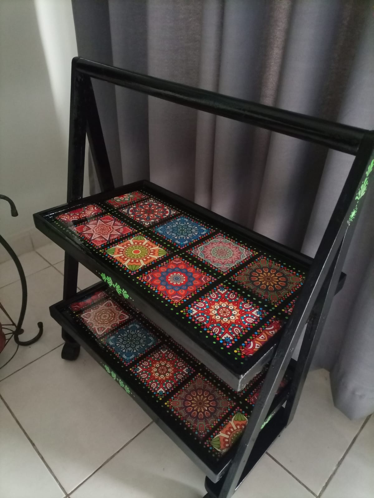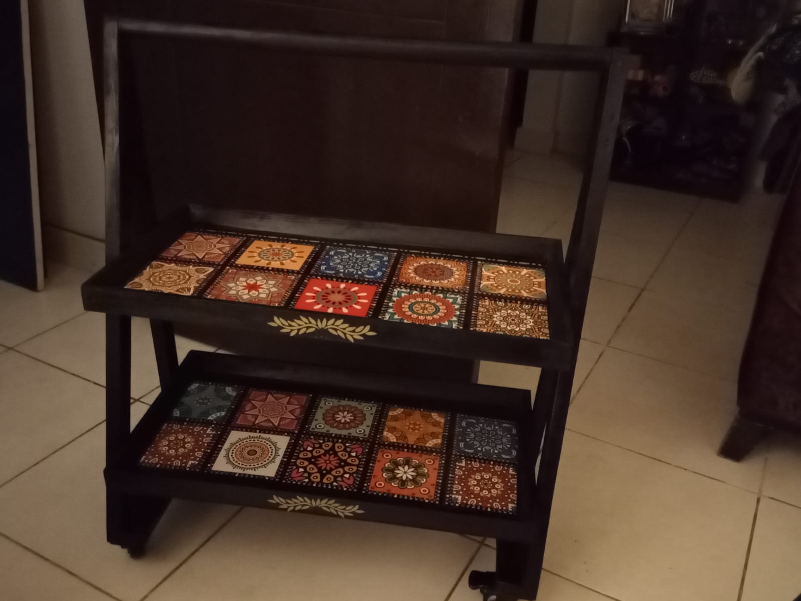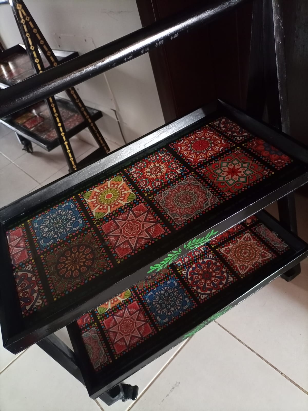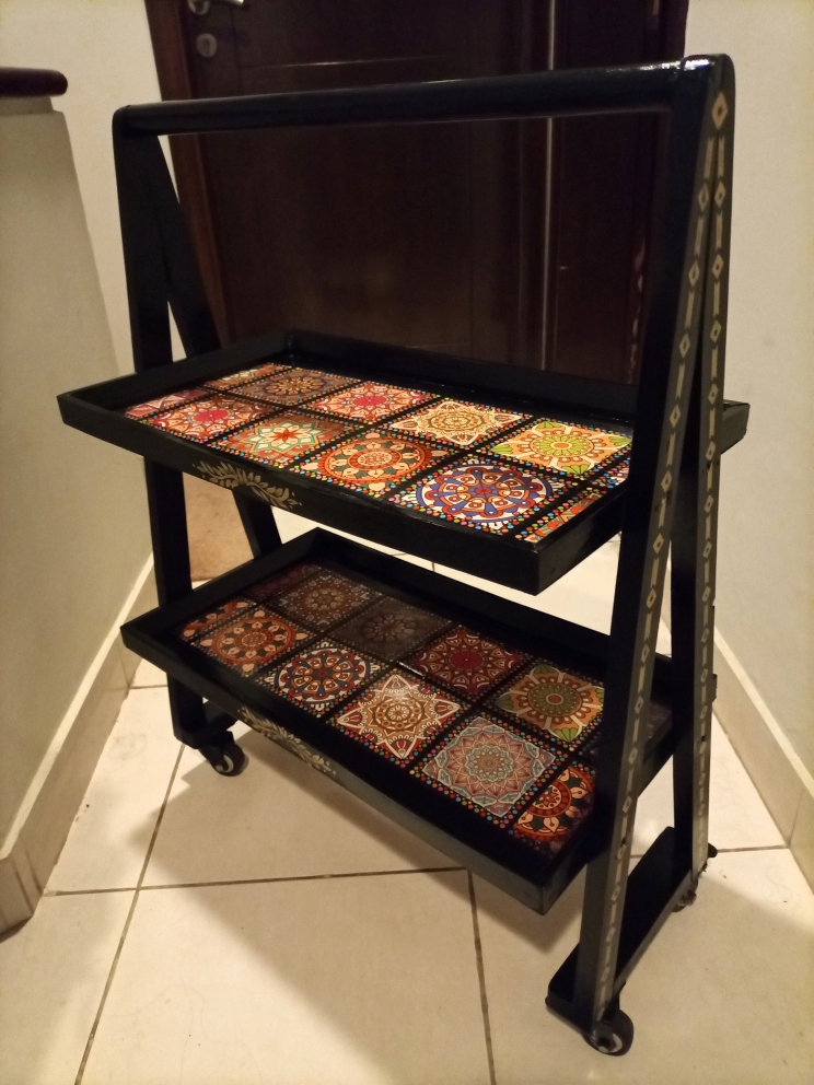A handcrafted wooden serving trolley featuring intricate hand-painted geometric and floral motifs inspired by traditional folk art. Finished with a protective glass top and sturdy wooden frame, this functional art piece adds vibrant character and cultural charm to living, dining, or hospitality spaces.