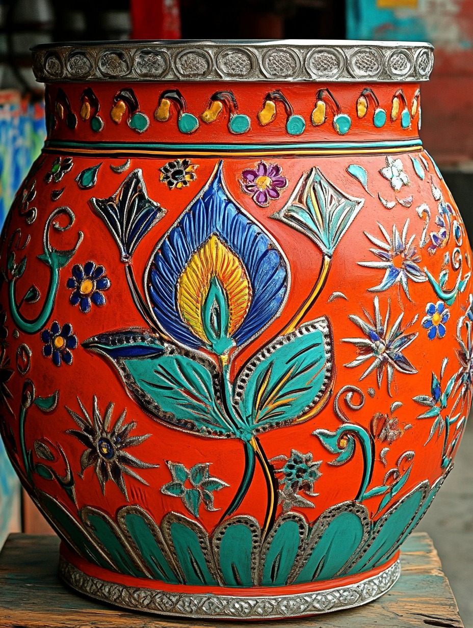 A striking hand-painted planter featuring intricate floral and lotus-inspired motifs in vibrant red, turquoise, and metallic accents. Crafted as a statement décor piece, this planter blends traditional artistry with bold color, making it ideal for indoor corners, entryways, or covered outdoor spaces.