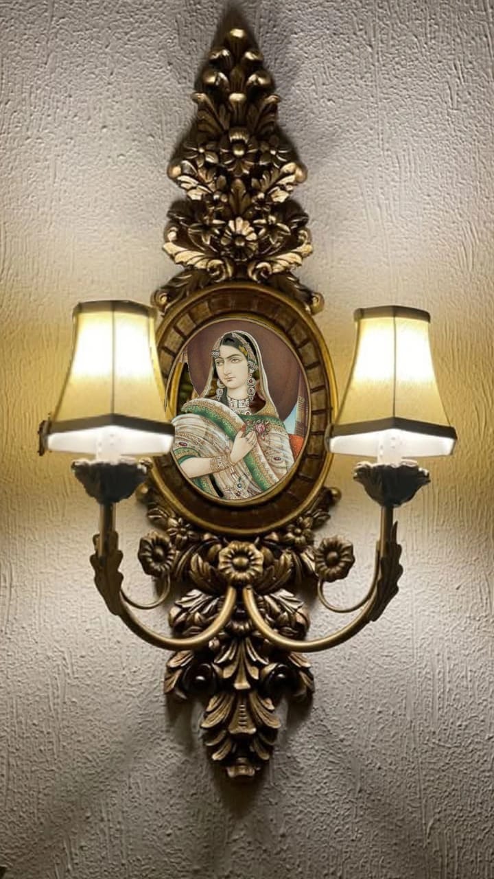 A magnificent hand-painted classic wall light crafted in hard silver metal, featuring exquisite miniature art at its center. Inspired by royal heritage and traditional craftsmanship, this statement piece blends ornate detailing with warm ambient lighting, creating an atmosphere of timeless elegance and cultural sophistication.